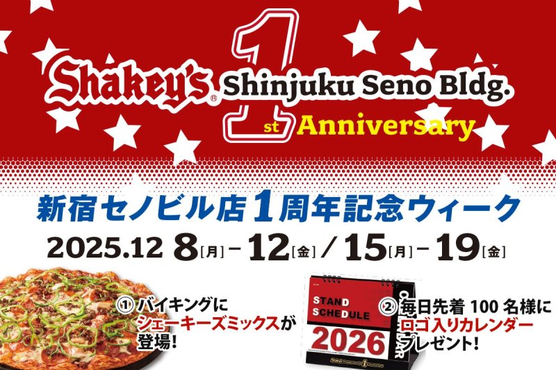 毎日先着100名様にシェーキーズ新宿セノビル店1周年記念ロゴ入りカレンダーをプレゼントいたします。