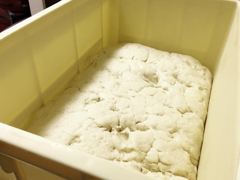 ピザ生地の元になる「ドウ」は、発酵後に約1日かけて熟成させます。発酵には正確な温度管理が必要で、氷を使って加える水の温度を調整し、捏ね上げ時の温度を一定に保っています。発酵には4時間、冷蔵庫内での熟成に18時間を要します。