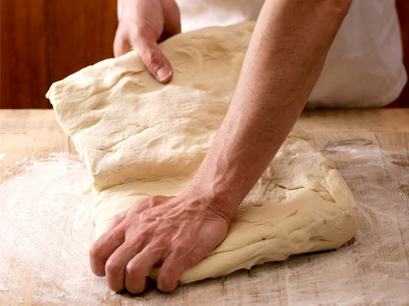 シェーキーズのすべての店舗で、粉の状態からピザ生地を作っています。捏ね上げ(ミキシング)から発酵、生地に延ばす作業(ローリング)まですべて店内で行います。サクッとしたクリスピーなピザ生地を作り出すためには欠かせない作業です。