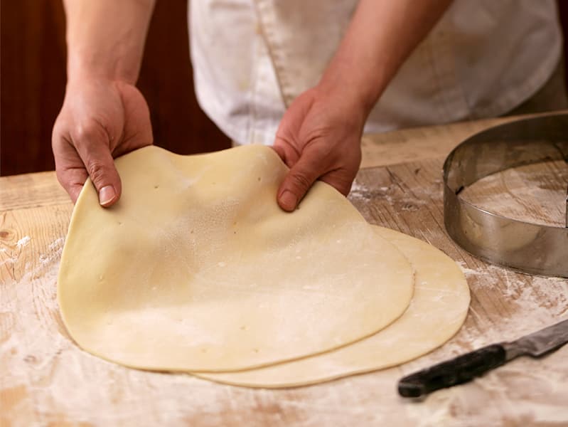 生地のおいしさを決めるローリング作業。大きなシーターを使って、ピザ生地の元(ドウ)を厚さ数ミリまで薄く伸ばしていきます。刻々と変化する生地の状態と力加減のバランスが難しい職人技です。